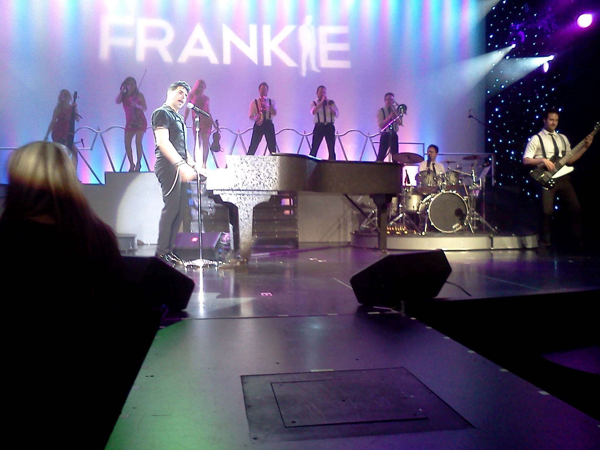 I took the elevator downstairs to see the show. My peeps booked me into a front row seat - at the end of the stage runway! Our Thursday night crowd was small but mighty, and Frankie & his ensemble cranked out a huge and powerfully fun wall of sound the entire night. They were so hot the fire alarm wet off about half way through the show. No matter, Frankie kept playing.